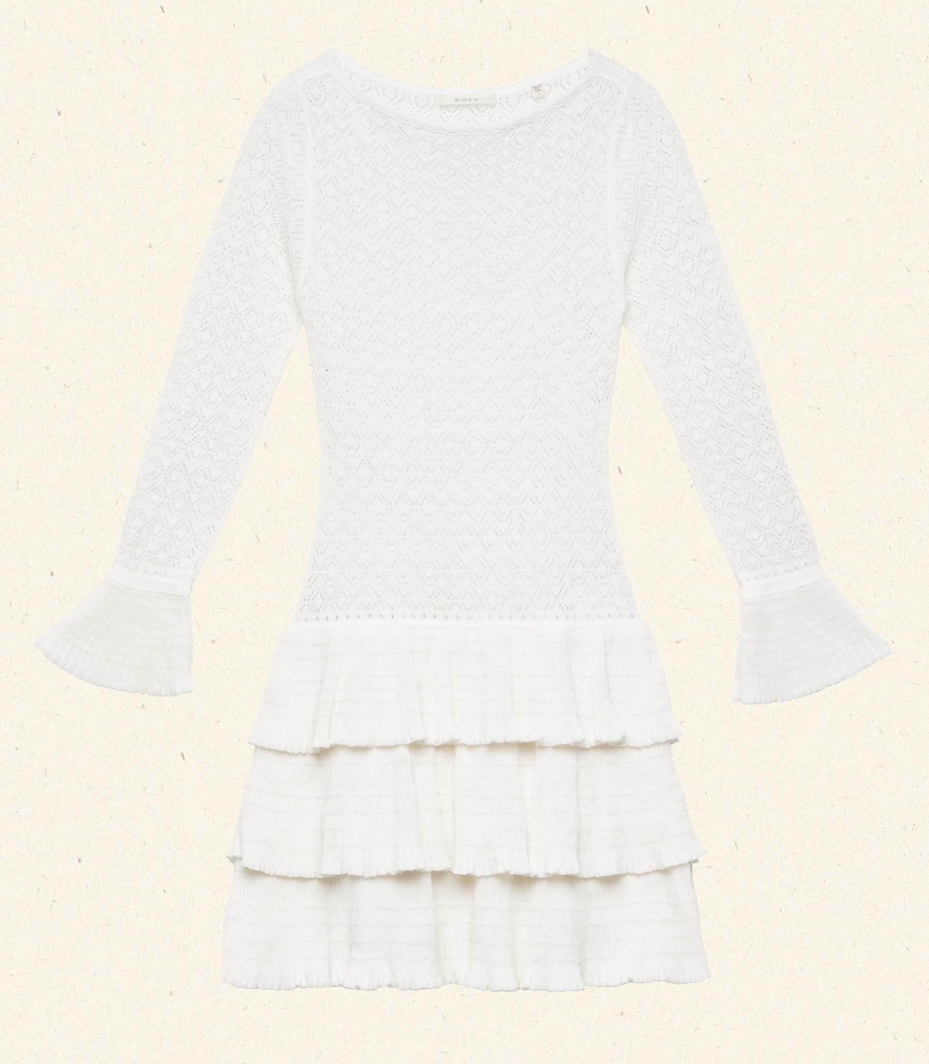 In a lightweight, slightly sheer viscose blend, the ‘60s-inspired Amelina Dress features a bateau neckline, bracelet-length sleeves, and a tiered mini skirt. The fitted bodice and sleeves are detailed with a delicate allover pointelle design, and ruffles finish the sleeve cuffs.