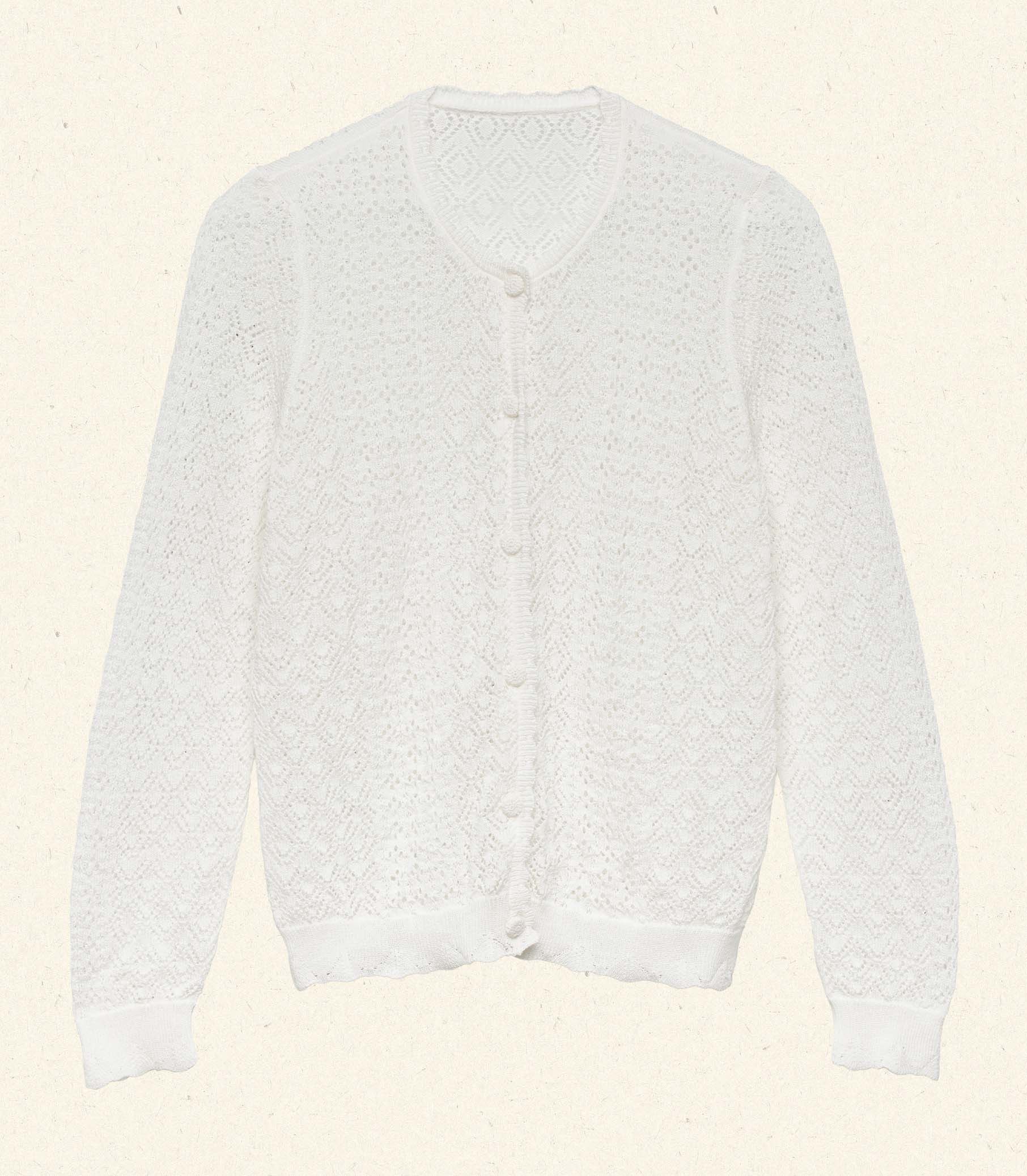 The Diane Cardigan is crafted from a lightweight, slightly sheer viscose blend with a delicate allover pointelle design inspired by Victorian-era bobbin lace. The Diane features a classic crew neck and bracelet-length sleeves, finished with crocheted buttons and scallop edge ribbing at the neckline, sleeve cuffs, and hem.