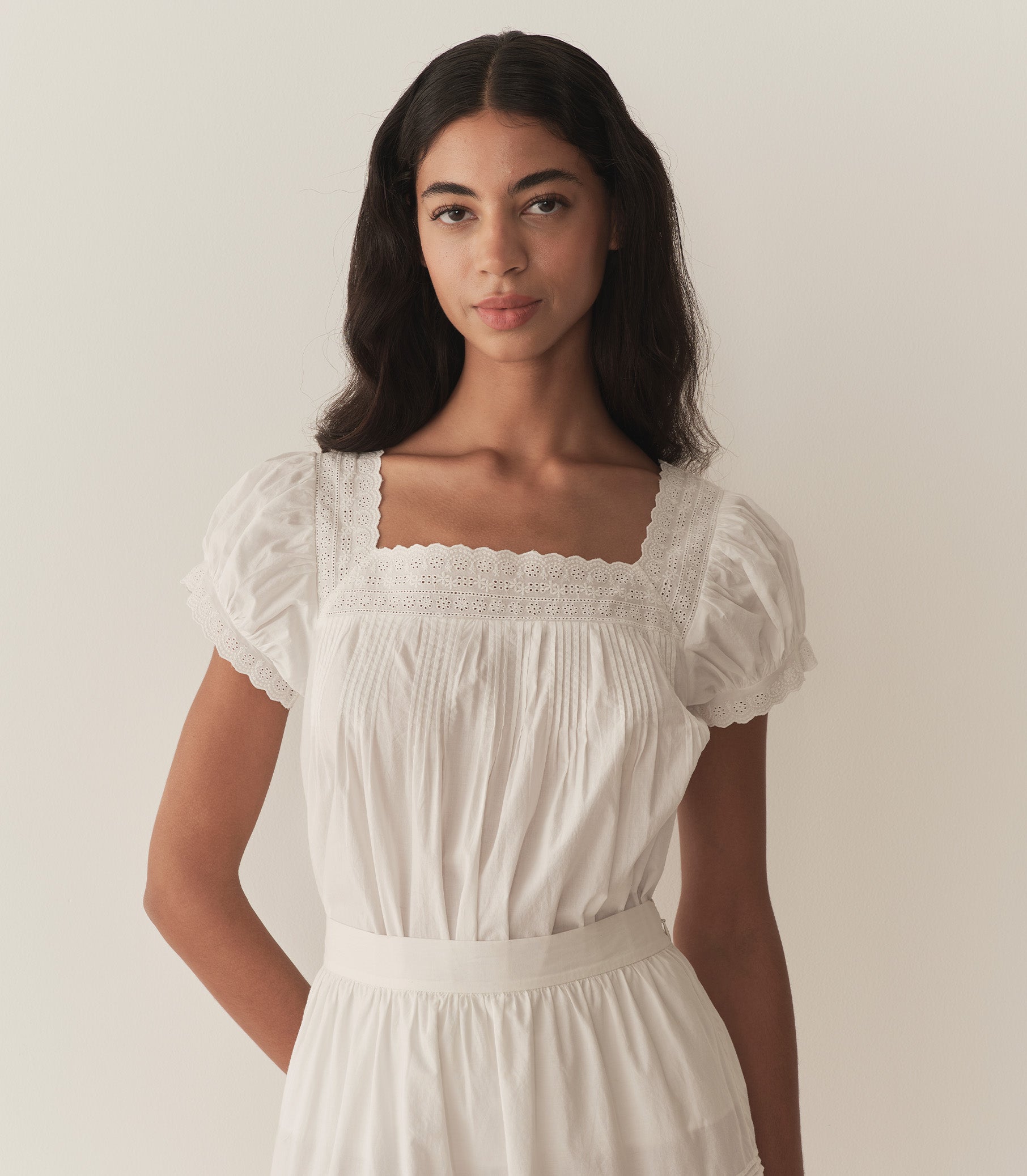 Crafted from crisp organic cotton poplin, the Francia Top features a breezy silhouette, a square neckline accented with pintucks, and short puffed sleeves. Embroidered scallop eyelets grace the sleeve cuffs and neckline. Wear it loose, or tuck it into your favorite high-waisted shorts.