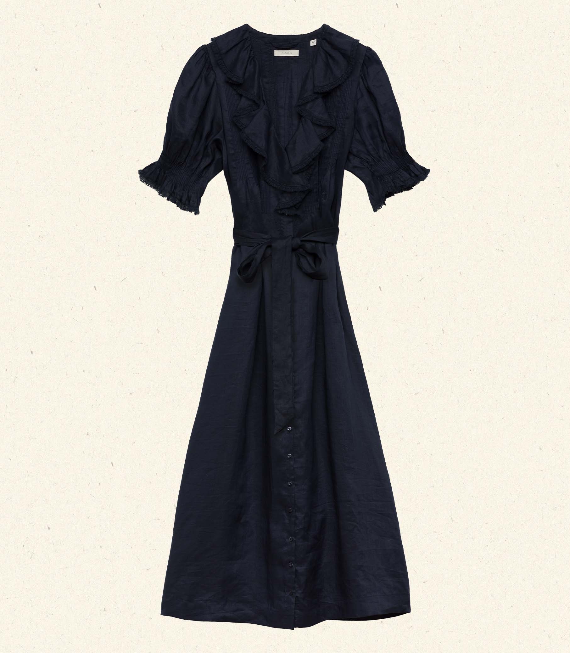 Our best-selling Henri Top reimagined as an easy-wearing midi dress, the Harriette is crafted in a lightweight ramie, featuring short puffed sleeves, a plunging V-neckline framed with cascading lace-trimmed ruffles and delicate clustered pintucks at the yoke, back, and short puffed sleeves. A line of hidden starburst buttons extend down the front, giving way to an ankle-grazing A-line skirt, and a detachable belt allows you to cinch the waist. For an antique-inspired finishing touch, an embroidered “D” at the left chest nods to Victorian-era monograms.