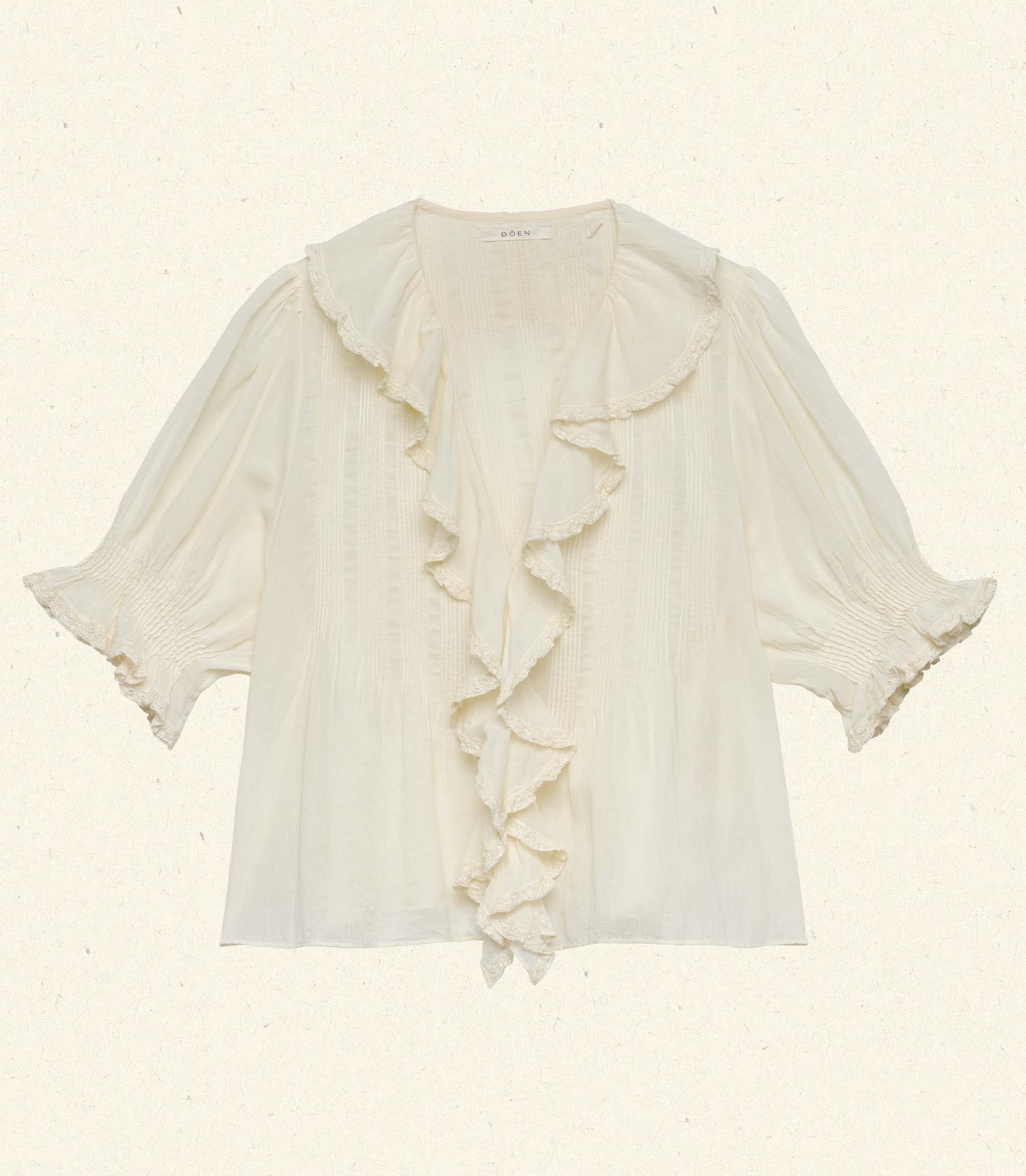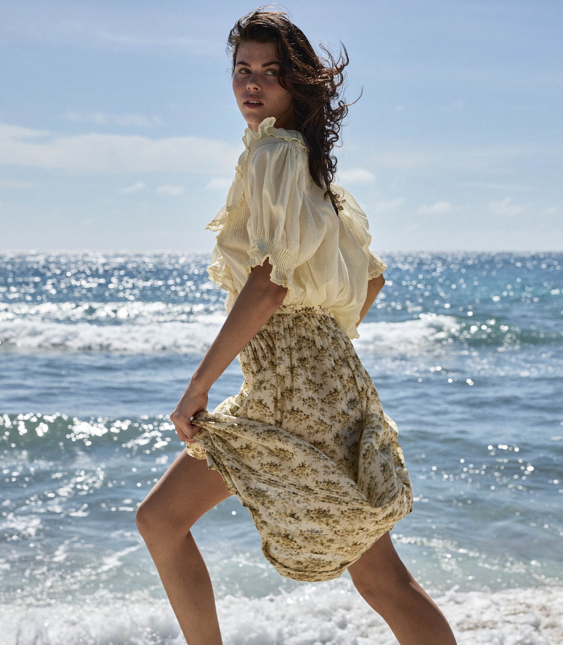 Crafted from the softest organic cotton voile, the Edwardian-inspired Henri Top—which made its debut in Spring 2018—is a Favorite Character we find ourselves returning to again and again. It features a plunging V-neckline framed with cascading lace-trimmed ruffles that extend down the bodice and delicate clustered pintucks at the yoke, back, and short puffed sleeves. A line of hidden starburst buttons run up the center front.