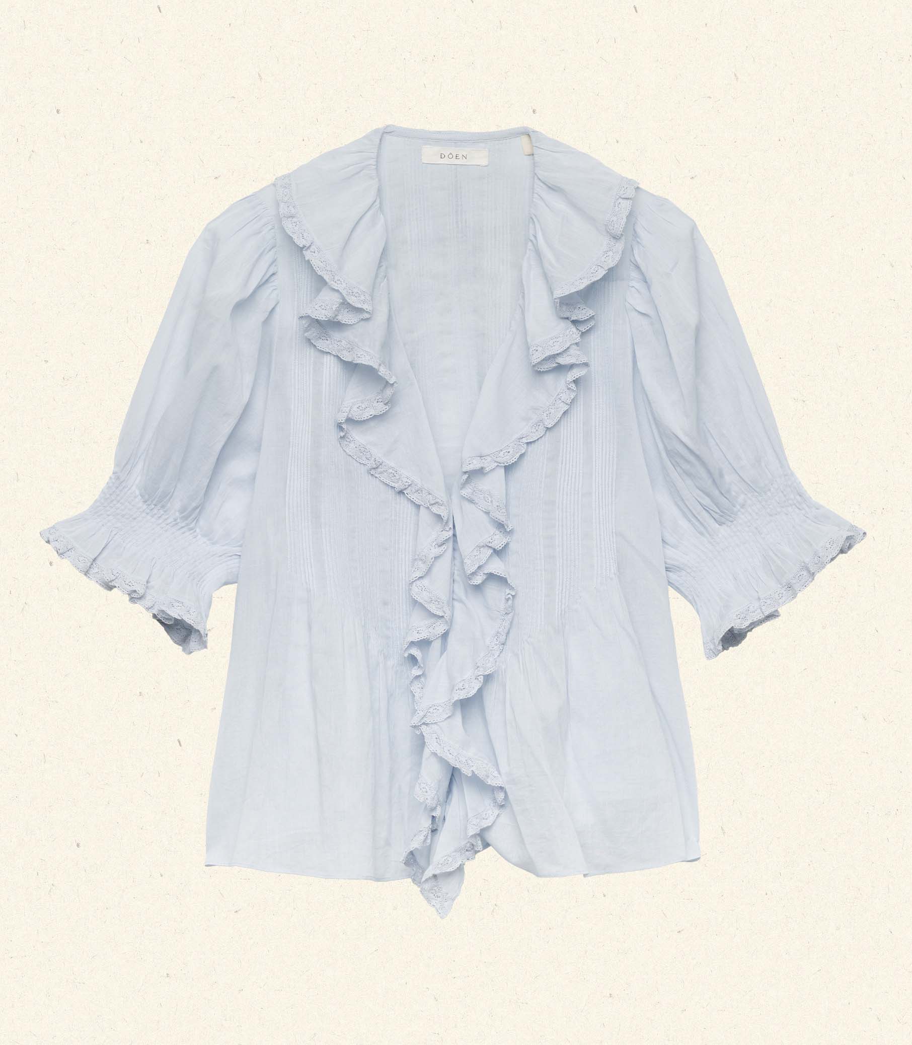 Crafted from the softest organic cotton voile, the Edwardian-inspired Henri Top—which made its debut in Spring 2018—is a Favorite Character we find ourselves returning to again and again. It features a plunging V-neckline framed with cascading lace-trimmed ruffles that extend down the bodice and delicate clustered pintucks at the yoke, back, and short puffed sleeves. A line of hidden starburst buttons run up the center front.