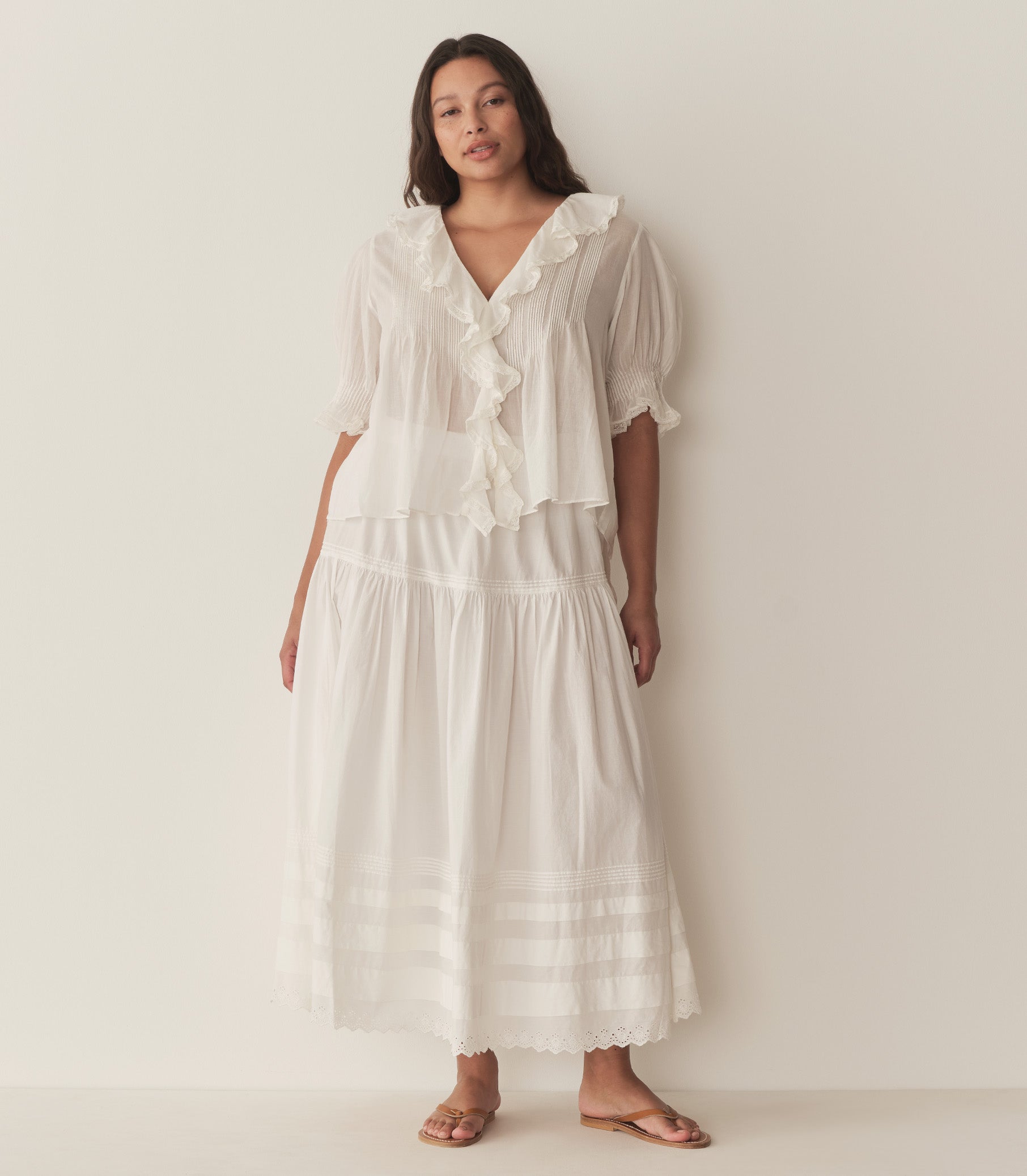 Crafted from the softest organic cotton voile, the Edwardian-inspired Henri Top - which made its debut in Spring 2018 - is a Favorite Character we find ourselves returning to again and again. It features a plunging V-neckline framed with cascading lace-trimmed ruffles that extend down the bodice and delicate clustered pintucks at the yoke, back, and short puffed sleeves. A line of hidden starburst buttons run up the center front. Wear it loose, or tuck it into your favorite high-waisted jeans.