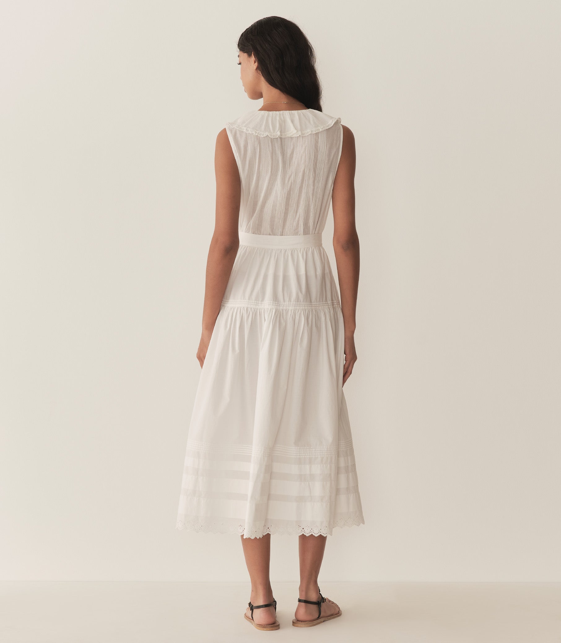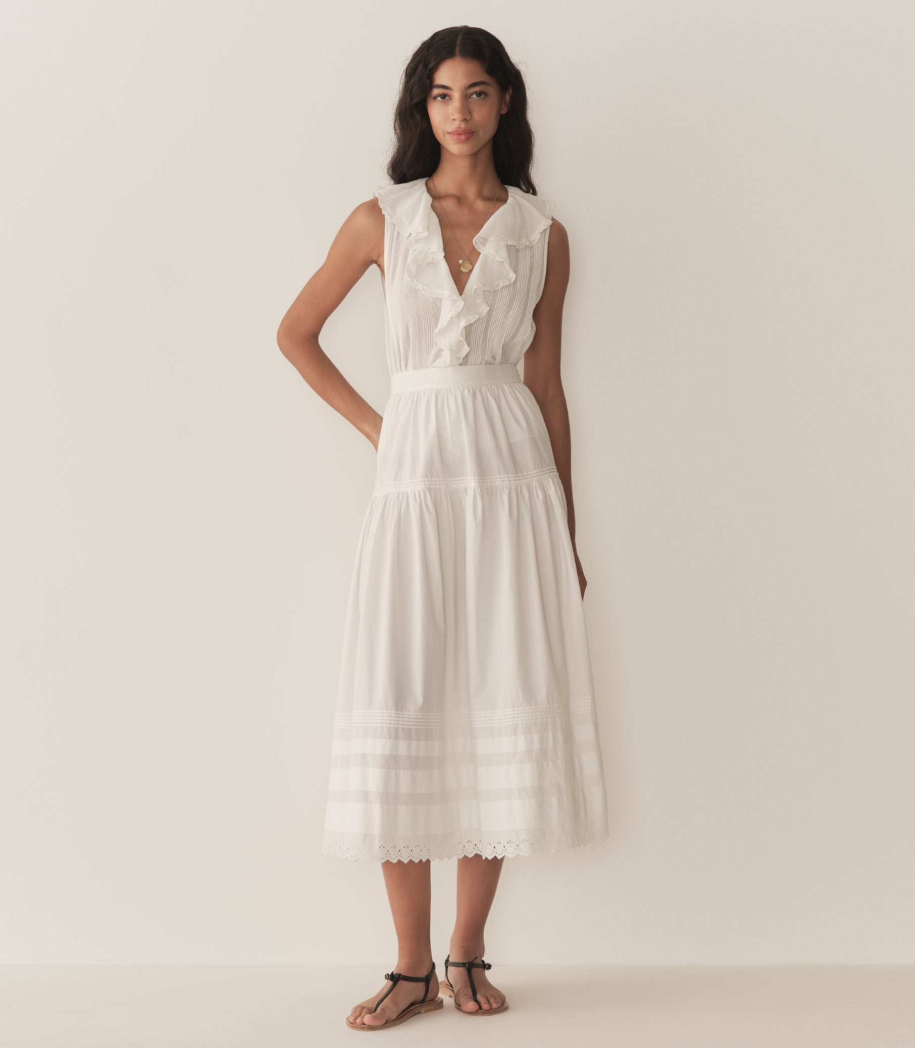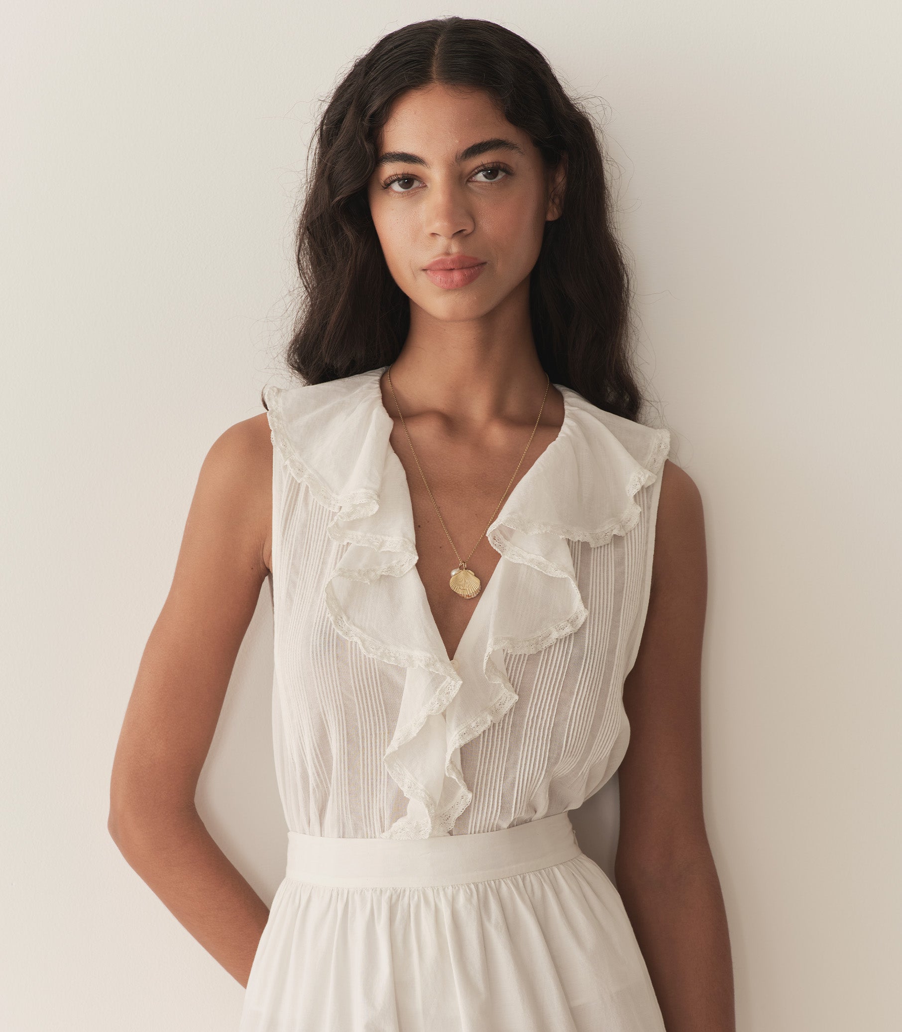 In soft, lightweight organic cotton voile, the Hilda is a sleeveless rendition of our best-selling Henri Top. It features a plunging V-neckline adorned with cascading lace-trimmed ruffles that extend down the bodice. Clustered pintucks lend texture to the yoke and back, while a line of hidden starburst buttons extends down the front.