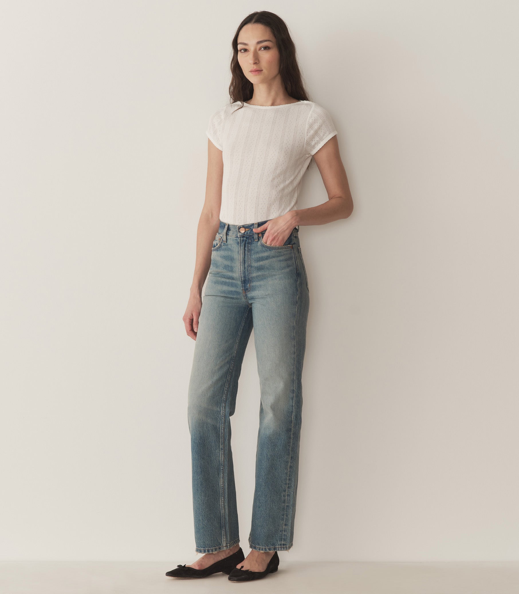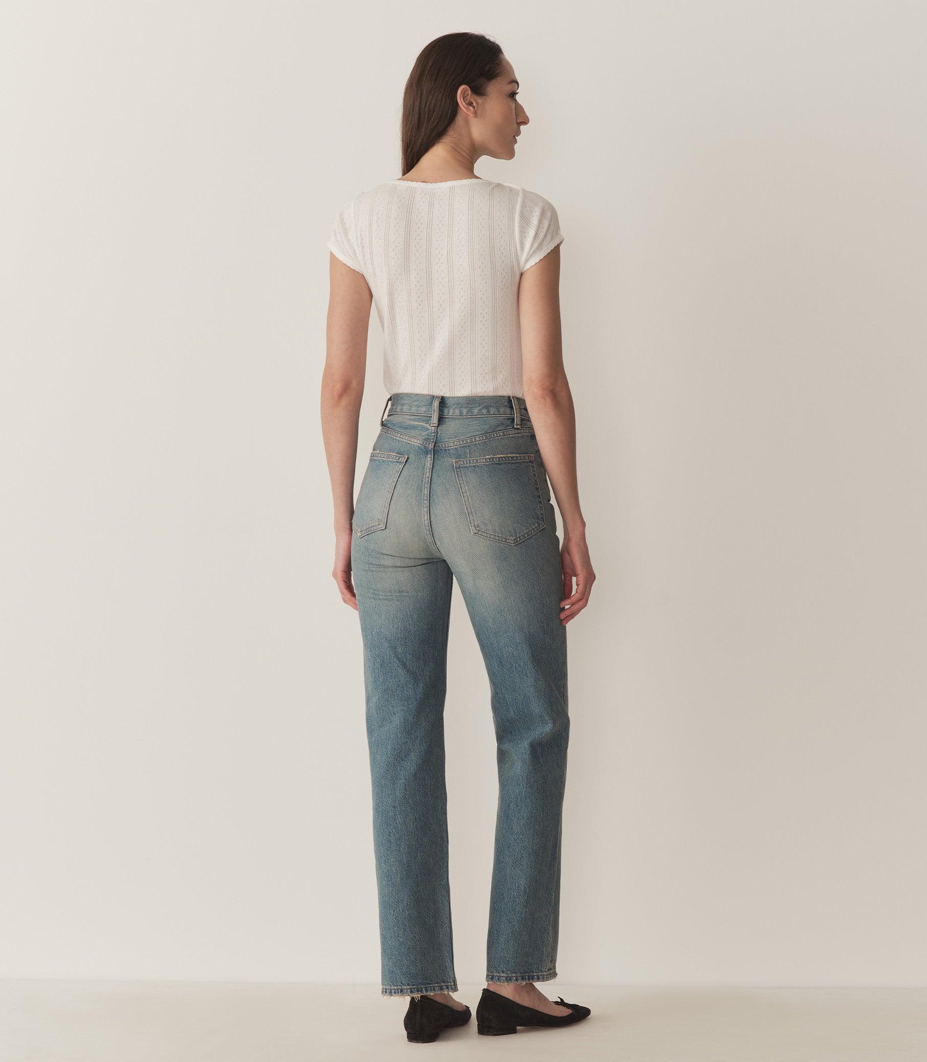 Crafted from 100% organic cotton denim, the Laurent Jean offers a straight fit, inspired by vintage slim-fit jeans from the ‘70s and a favorite of our co-founders Margaret and Katherine. Featuring a high rise, and long, straight leg, the Laurent is detailed with a button-and-zipper closure, pointed back pockets, and classic front pockets.