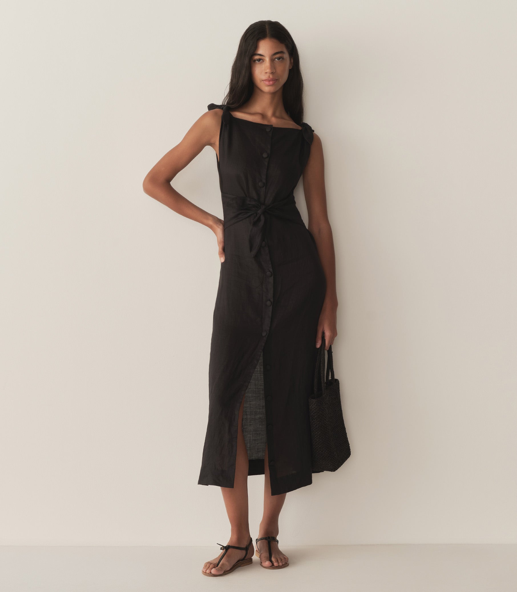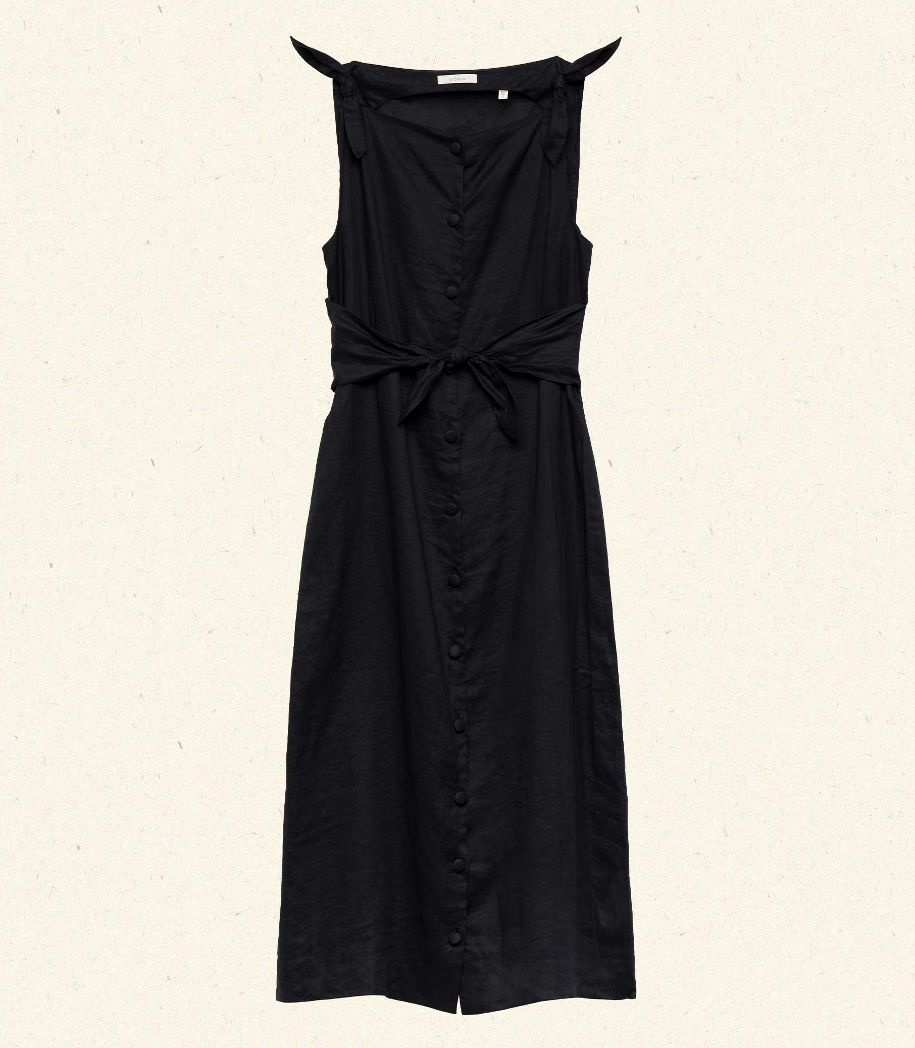 In lightweight ramie, the Levine Dress is a sleeveless column dress with a button front, a bateau neckline, functional waist and shoulder ties, and a center back slit at the hem for ease of movement.