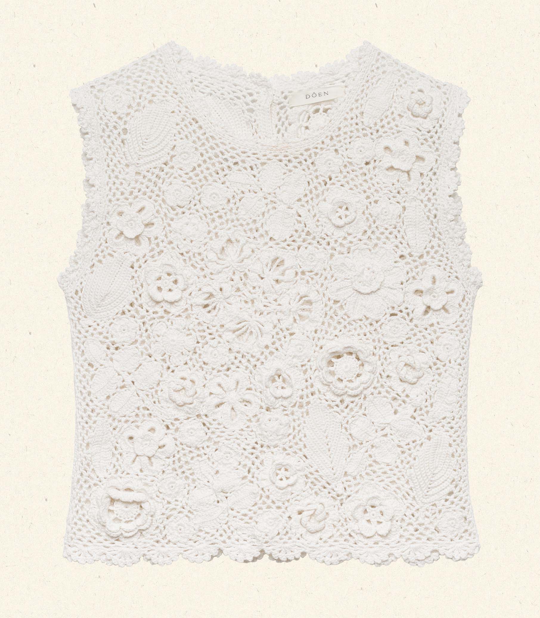 Made entirely by hand, the DÔEN Heirloom Marcia Top draws inspiration from our beloved Annalisa Dress. A true labor of love, the Marcia is a sleeveless style with a fitted silhouette. It features scallop crochet trim at the crew neckline, sleeve openings, and hem. Three hand-crocheted buttons extend down the back.