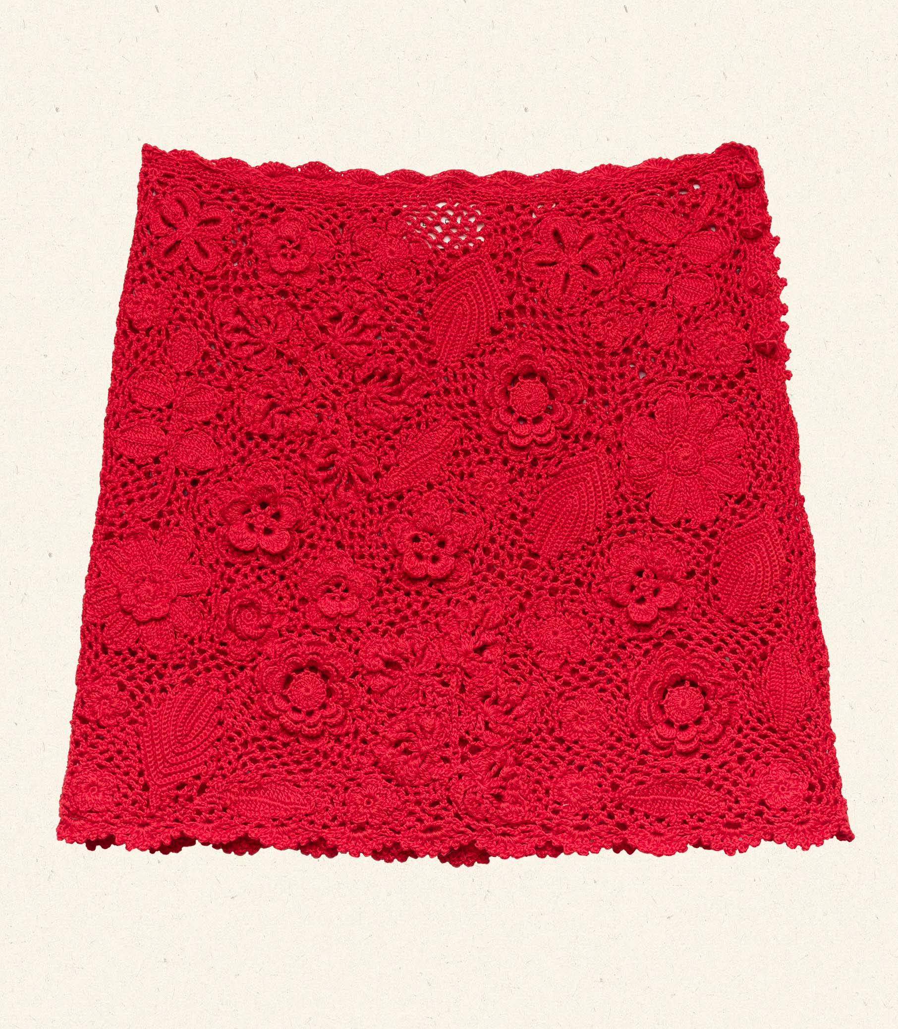 Crafted from 100% mercerized Pima cotton, each skirt is skillfully hand-crocheted by our artisans in Peru, with each one taking several days to complete. Groups of knitters hand-crochet each flower before they're meticulously hand-sewn onto the body of the skirt, in total passing through the hands of at least 15 different craftswomen before the piece is complete. Because each skirt is handmade, no two are exactly alike.