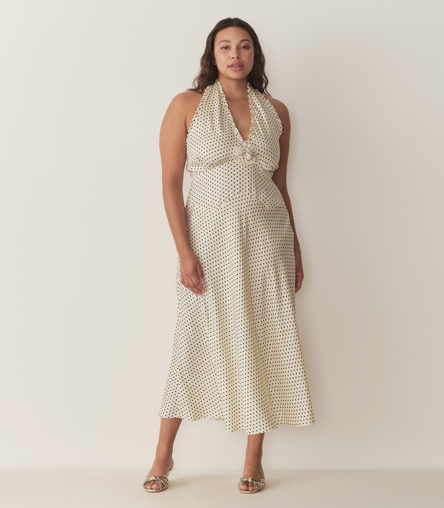 Crafted from a buttery silk-viscose twill and rendered in our new Portia Dot for Spring, the ‘90s-inspired Mazarin Dress features a plunging halter neckline adorned with petite ruffles and a removable rosette brooch, a fitted bodice with an invisible side zipper, and an ankle-grazing bias-cut skirt.