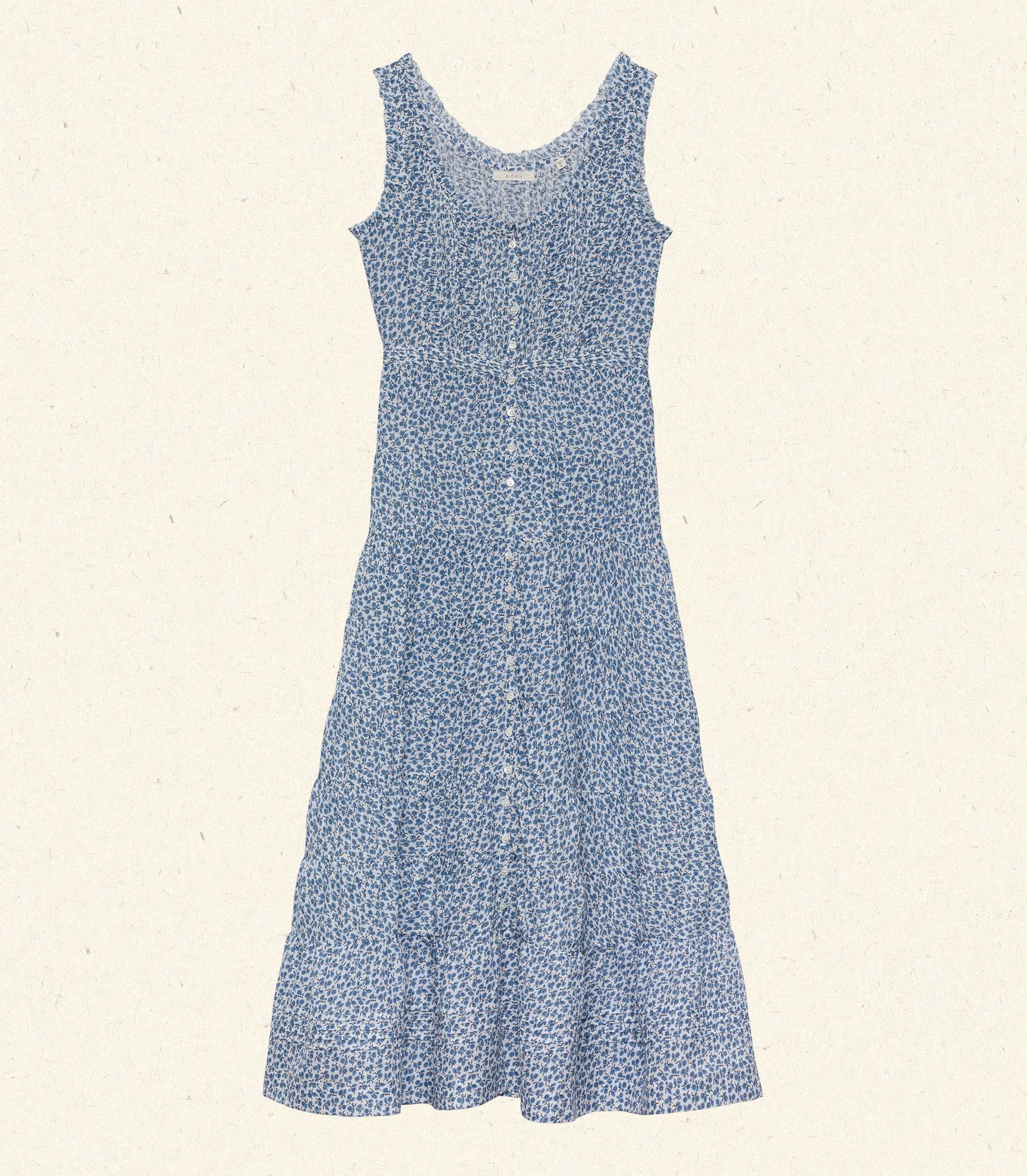 Crafted in a soft, lightweight organic cotton voile and adorned with our Cornflower Hillside Bloom, the Ottessa Dress features a scoop neckline and straps trimmed with petite ruffles. Alternating panels of pintucks and shirring lend texture to the fitted bodice, which gives way to an ankle-grazing A-line tiered skirt. Mother-of-pearl buttons extend down the center front.