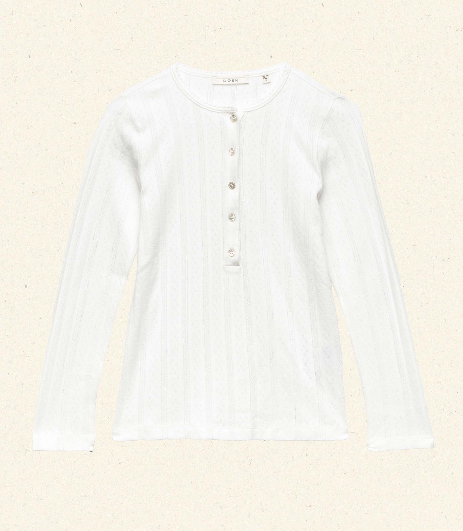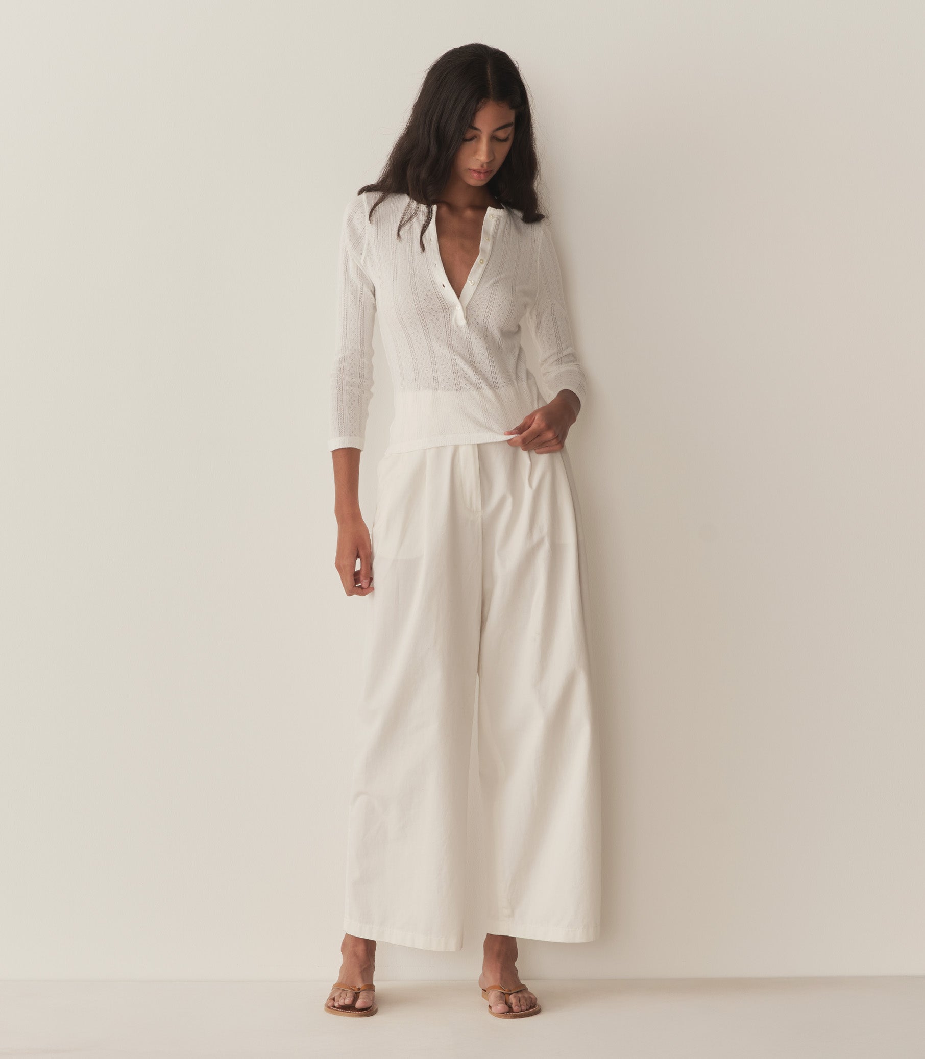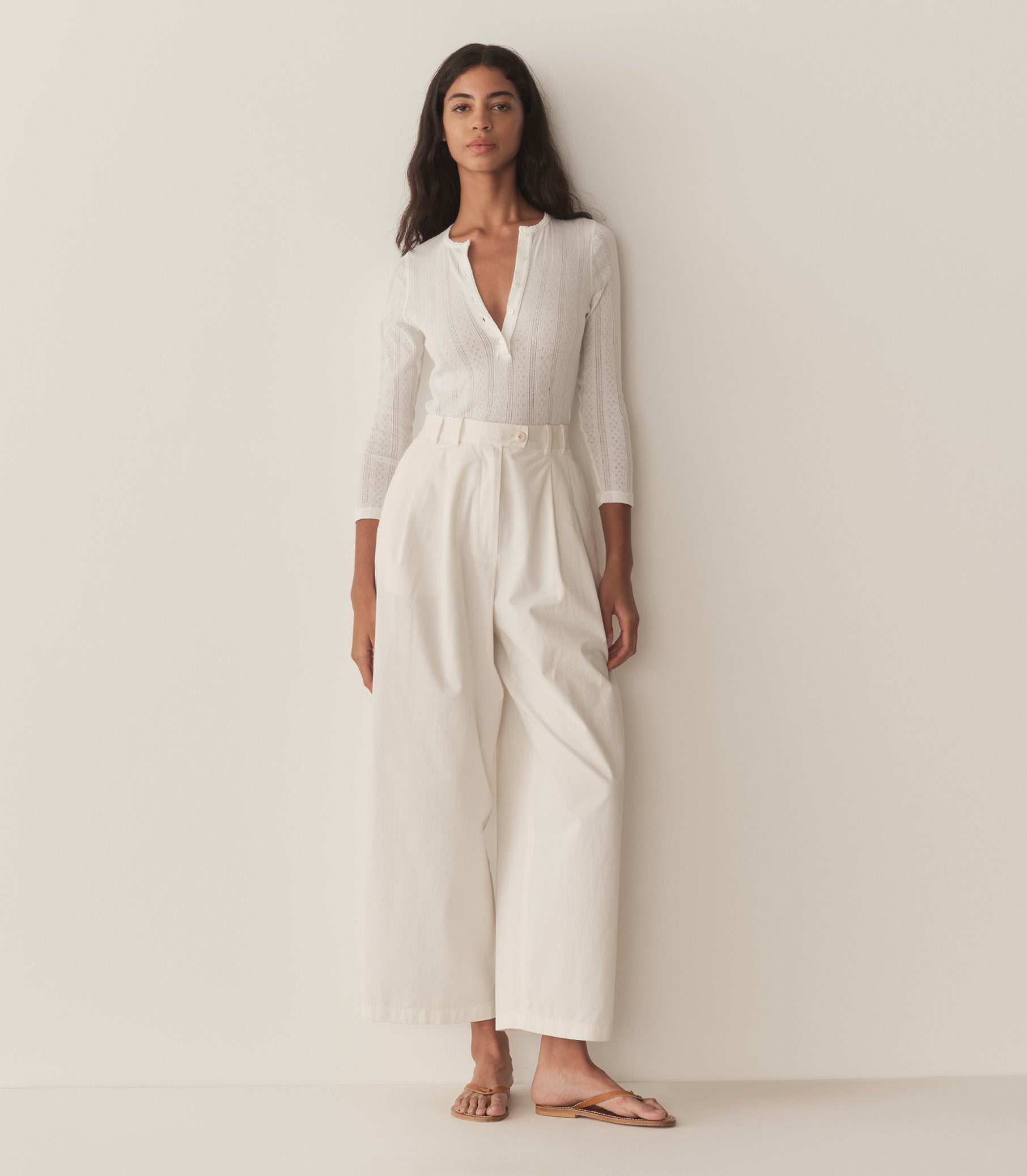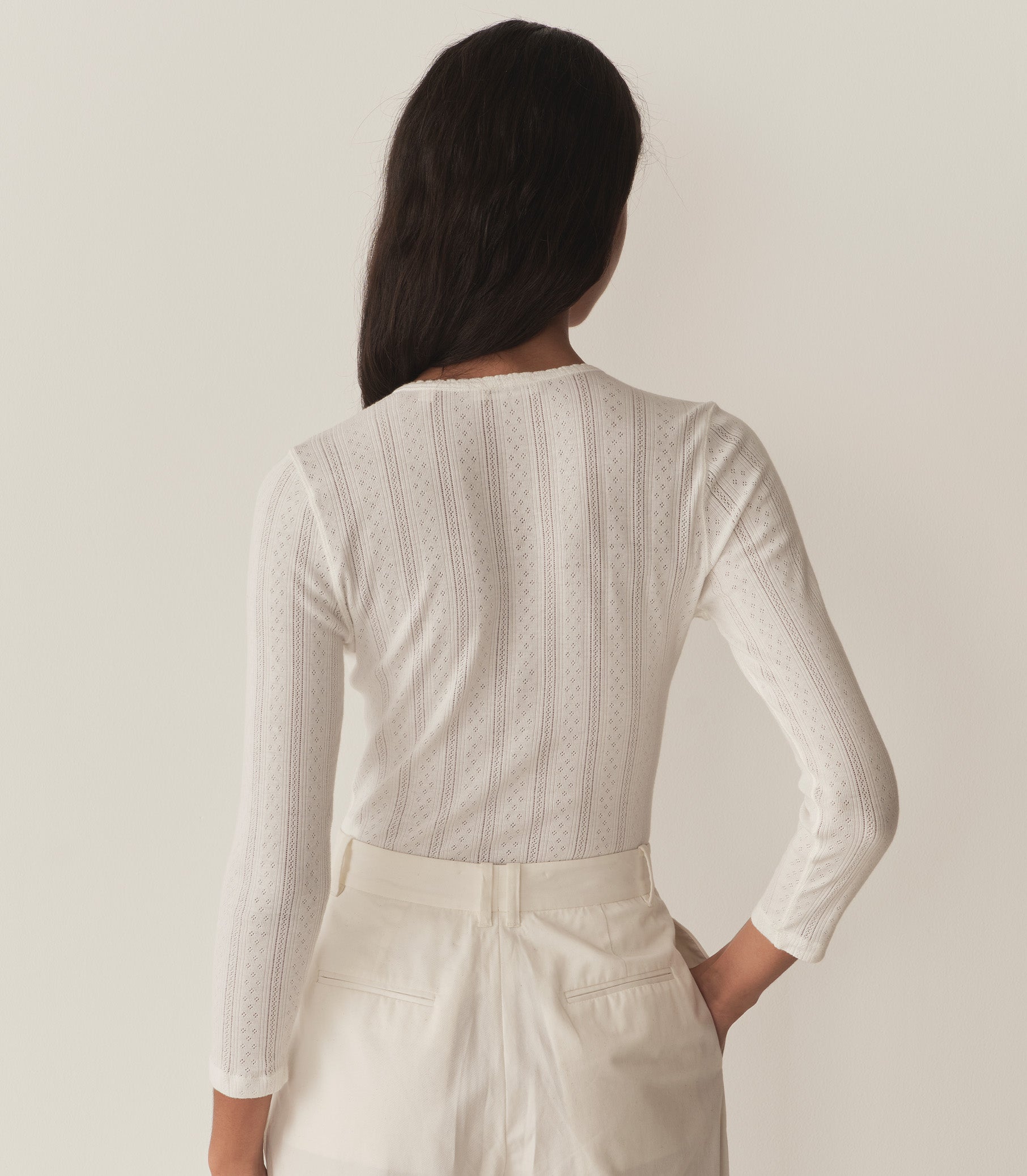 Crafted from the softest organic cotton pointelle, the Paola Tee is our take on a classic Henley. It features a fitted silhouette, three-quarter-length sleeves, and delicate mother-of-pearl buttons that extend from the rounded collar to the mid-bust. Perfect for layering, the Paola is sure to become a year-round staple.