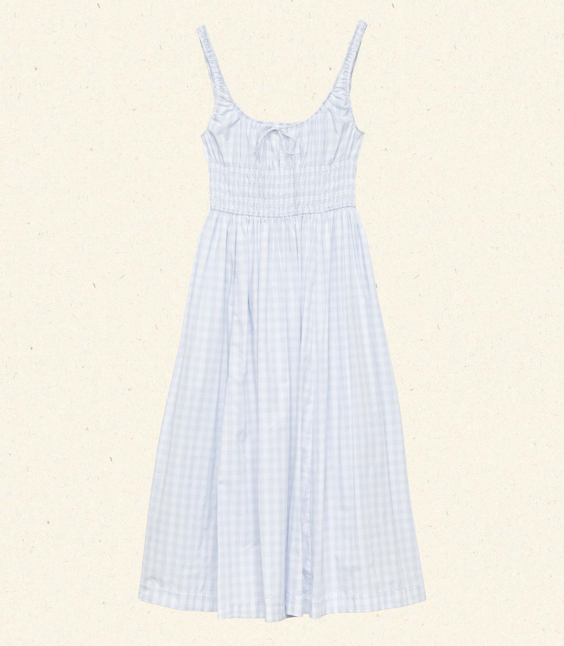 Crafted from crisp cotton poplin and rendered in a yarn-dyed Marjorie Gingham, the Quilla Dress is a sleeveless rendition of our beloved Quinn. The scoop neckline and gathered bust are detailed with an adjustable tie and a playful keyhole detail, while the smocked bodice gives way to a midi-length A-line skirt.