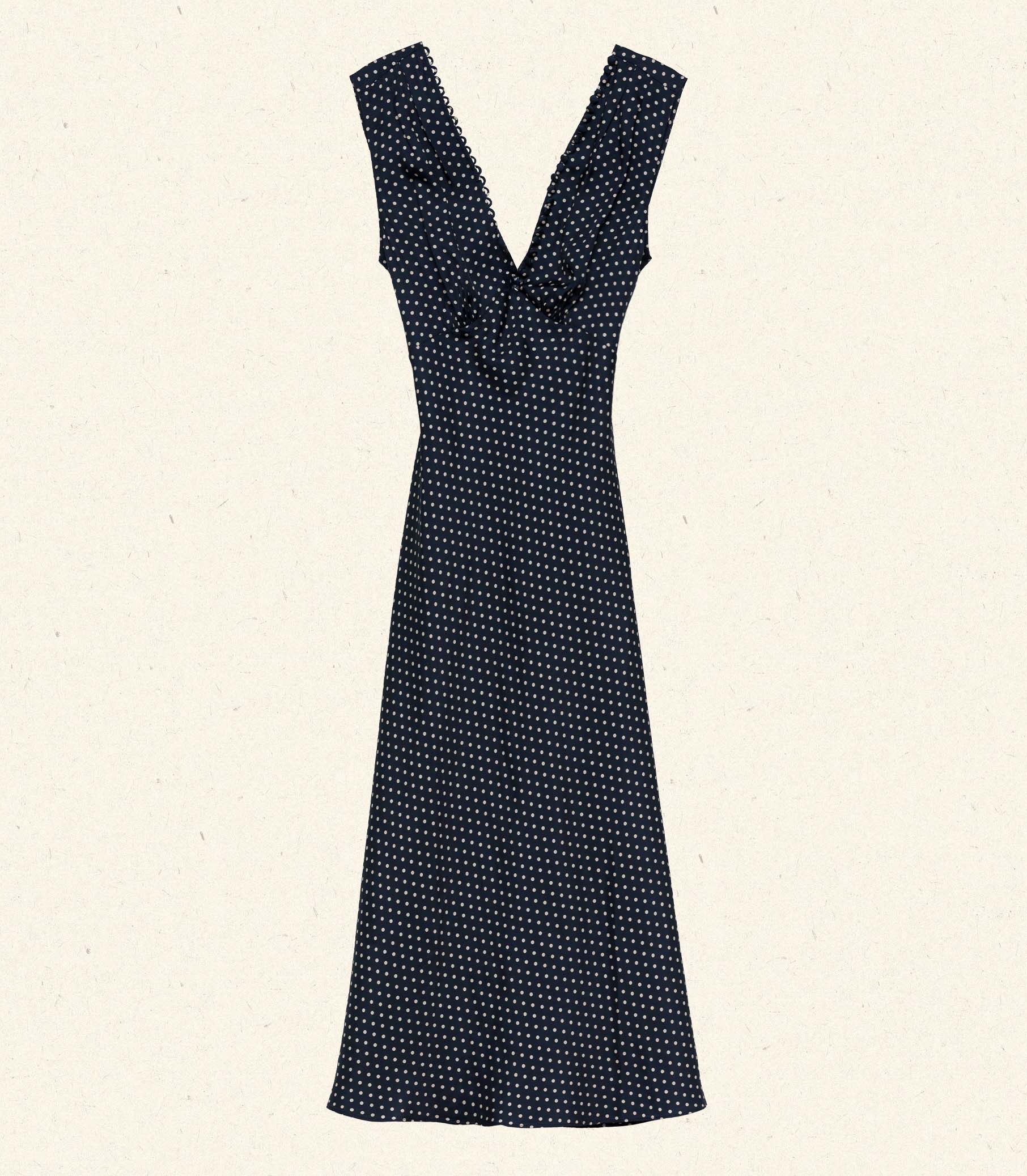 In a buttery silk-viscose twill and adorned with our playful navy-and-white Hepburn Dot, the ‘30s-inspired Tahlia Dress—a favorite of our co-founder Katherine—features a plunging V-neckline trimmed with decorative self-covered buttons. A fitted bodice with an adjustable back waist tie gives way to an ankle-grazing bias-cut skirt.